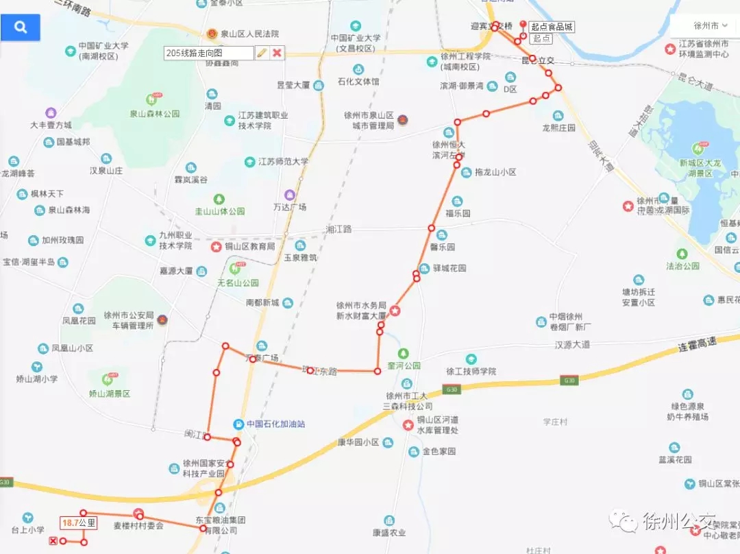 為滿足廣大市民出行需求,進一步擴大徐州高新區(qū)和市區(qū)的交通線網(wǎng),促進區(qū)域交通和諧發(fā)展,為更多的市民提供便捷的城市客運服務,徐州公交開通了205路線,并于12月18日上午8:30分開始試運行。具體線路走向及??空军c如下: