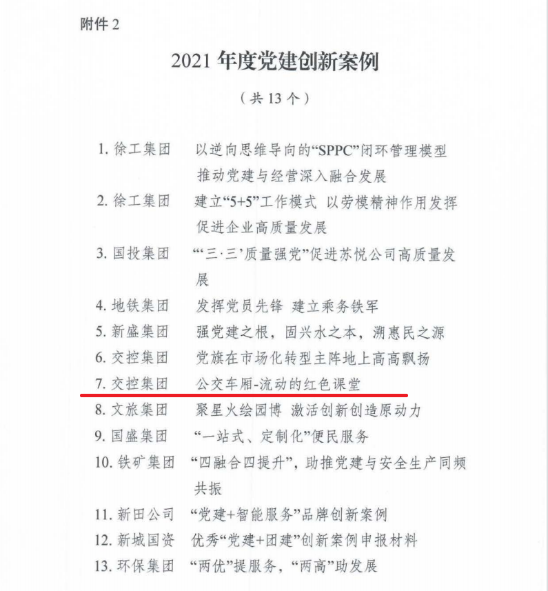 同時(shí),市國資委黨委通報(bào)了2021 年度十佳黨建品牌和優(yōu)秀"黨建+"創(chuàng)新案例評(píng)選表彰結(jié)果,徐州公交《公交車廂-流動(dòng)的紅色課堂》獲評(píng)2021年度黨建創(chuàng)新案例。