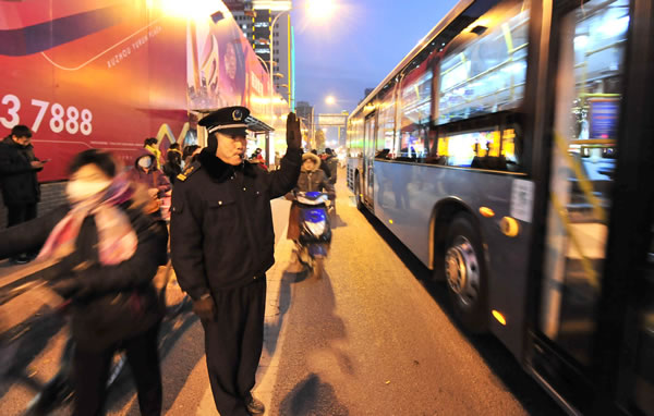 平安夜,客流增加,公交服務(wù)督導(dǎo)隊員有序指揮車輛,確保乘客走好走了