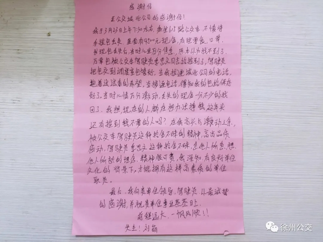 前幾日,市民劉女士在二十四中乘坐615路6952車(chē)前往城建家園,上車(chē)后,劉女士將隨身攜帶的手提包放在了座位上,下車(chē)時(shí)有些匆忙,將手提包遺忘在了車(chē)上。駕駛員季恩文到食品城公交首末站打掃衛(wèi)生時(shí),發(fā)現(xiàn)了劉女士丟失的手提包。由于已經(jīng)到了發(fā)車(chē)時(shí)間,季師傅將包收好,到達(dá)劉灣調(diào)度室后交給了工作人員。經(jīng)檢查,包里有4500元現(xiàn)金、駕駛證、身份證等重要物品,此時(shí),發(fā)現(xiàn)手提包丟失了的劉女士也撥打了服務(wù)熱線,得知她的物品已被妥善保管后,劉女士十分激動(dòng)。當(dāng)天下午,劉女士拿回失物并特意寫(xiě)了一封感謝信表達(dá)對(duì)季師傅的感激之情。