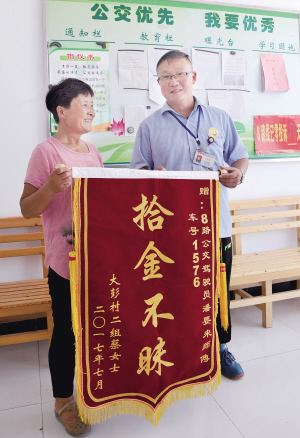7月21日《都市晨報(bào)》A08版刊登了《急匆匆出門(mén)見(jiàn)朋友 3000多元現(xiàn)金遺失公交上》一文,講述了8路駕駛員潘要來(lái)拾金不昧的事跡。7月19日下午,家住銅山區(qū)大彭鎮(zhèn)的蔡女士從大彭鎮(zhèn)乘坐8路車(chē)到宣武,慌忙下車(chē)后,蔡女士忽然發(fā)現(xiàn)裝3000多元錢(qián)的布包不見(jiàn)了。兩人回憶,當(dāng)時(shí)忙著抱孩子了,把包遺失在了公交車(chē)上。蔡女士連忙回去,找到另外一名8路車(chē)駕駛員幫她聯(lián)系了8路調(diào)度室,很快傳來(lái)好消息:包找到了。原來(lái),蔡女士乘坐的8路車(chē)駕駛員潘要來(lái)看到了座位上有一個(gè)東西,當(dāng)時(shí)他誤認(rèn)為是坐墊,后來(lái),他看到有個(gè)乘客直接奔向那個(gè)座位,一屁股坐了下來(lái),神色有些慌張。潘師傅從后視鏡看到,那個(gè)東西鼓鼓囊囊不像坐墊,便走了過(guò)去,將包拿回駕駛室。